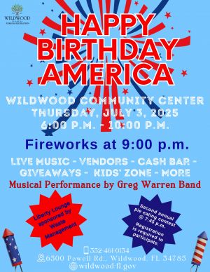 Join us on THURSDAY, JULY 3, 2025, for live music, vendors, a kids’ zone, giveaways, pie eating contest, cash bar, and a professional fireworks display. The fun begins at 6:00 p.m. with fireworks at 9:00 p.m.! This family-friendly event is free to attend.