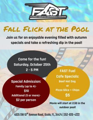 Saturday, October 25th, come enjoy a relaxing and fun evening in the pool all while a fall favorite flick plays ...